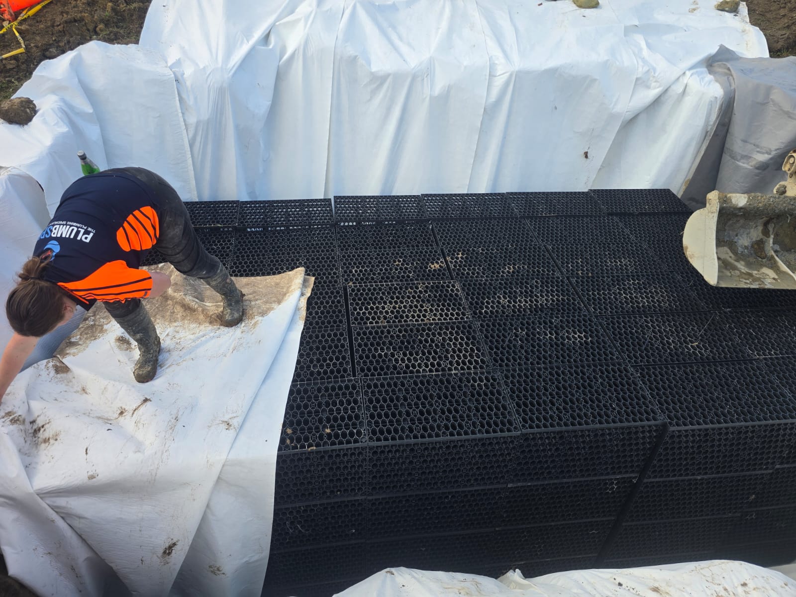 A recent 16,000L soak pit installation, done by Plumbspec was used on a site where no stormwater drains were available. A 5m x 2.5 hole had to be excavated and lined up with filter cloth, before placing Cirtex disposal pods and reinstating the site.